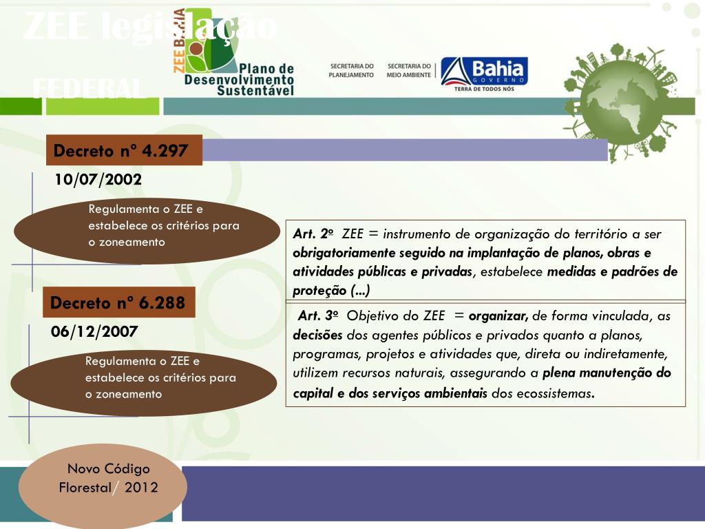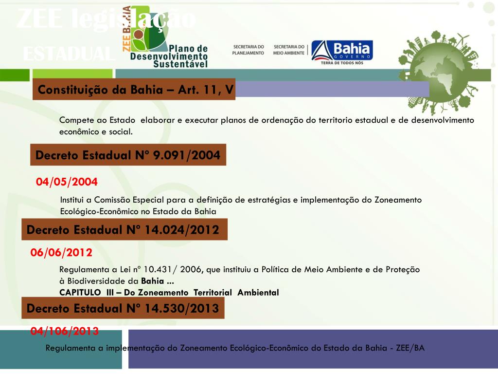 ZEE legislação ESTADUAL • Constituição da Bahia – Art. 11, V • Compete ao Estado elaborar e executar planos de ordenação do territorio estadual e de desenvolvimento econômico e social. Decreto Estadual Nº 9.091/2004 04/05/2004 • Institui a Comissão Especial para a definição de estratégias e implementação do Zoneamento Ecológico-Econômico no Estado da Bahia • Decreto Estadual Nº 14.024/2012 06/06/2012 • Regulamenta a Lei nº 10.431/ 2006, que instituiu a Política de Meio Ambiente e de Proteção à Biodiversidade da Bahia ... • CAPITULO III – Do Zoneamento Territorial Ambiental Decreto Estadual Nº 14.530/2013 04/106/2013 • Regulamenta a implementação do Zoneamento Ecológico-Econômico do Estado da Bahia - ZEE/BA