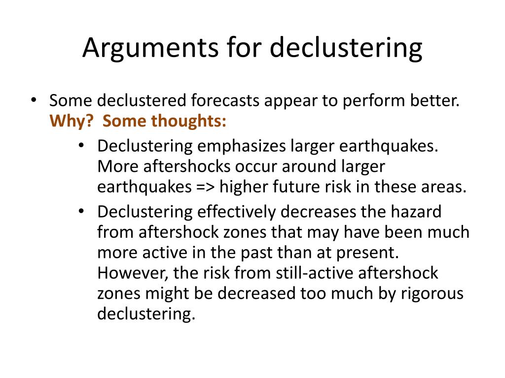 Arguments for declustering • Some declustered forecasts appear to perform better. Why? Some thoughts: • Declustering emphasizes larger earthquakes. More aftershocks occur around larger earthquakes => higher future risk in these areas. • Declustering effectively decreases the hazard from aftershock zones that may have been much more active in the past than at present. However, the risk from still-active aftershock zones might be decreased too much by rigorous declustering.
