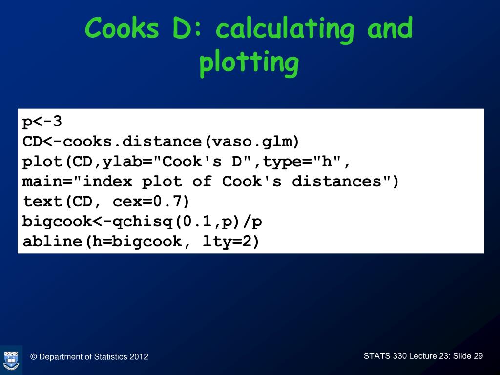 Cooks D: calculating and plotting p<-3 CD<-cooks.distance(vaso.glm) plot(CD,ylab="Cook's D",type="h", main="index plot of Cook's distances") text(CD, cex=0.7) bigcook<-qchisq(0.1,p)/p abline(h=bigcook, lty=2)