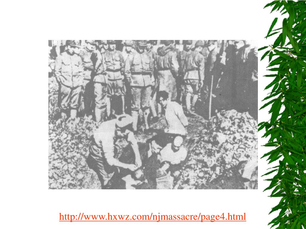 Nanjing Massacre(1937-1938) • In December 1937, Nanjing fell to the Japanese Imperial Army. • The Japanese army launched a massacre for six weeks. According to the records of several welfare organizations which buried the dead bodies after the Massacre, around three hundred thousand people, mostly civilians and POWs, were brutally slaughtered. • Over twenty thousand cases of rape were reported. Many of the victims were gang raped and then killed. The figure did not include those captives who were sent to army brothels (the so-called "comfort stations"). • http://www.gendercide.org/case_nanking.html