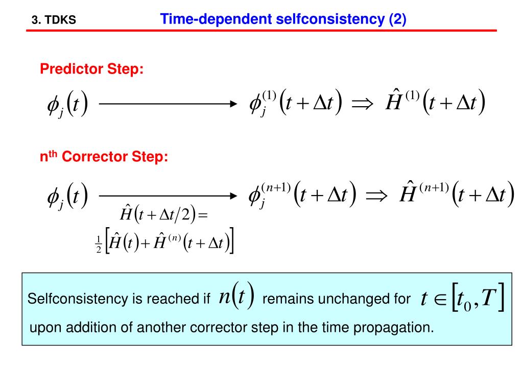 3. TDKSTime-dependent selfconsistency (2) Predictor Step: nth Corrector Step: Selfconsistency is reached if remains unchanged for upon addition of another corrector step in the time propagation.