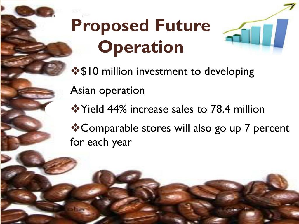 a bulous Coffee Asia. Prepared by Anh Nguyen Marketing Manager. Proposed Future Operation. $10 million investment to developing Asian operation Yield 44% increase sales to 78.4 million Comparable stores will also go up 7 percent for each year. Opportunity.