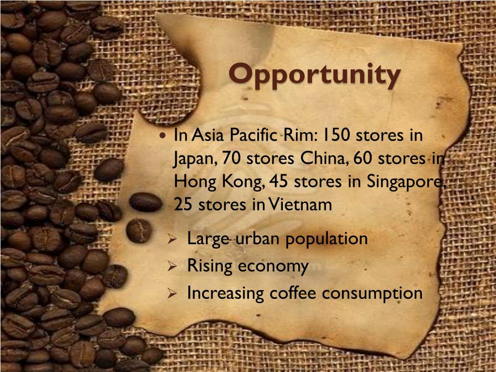 Opportunity • In Asia Pacific Rim: 150 stores in Japan, 70 stores China, 60 stores in Hong Kong, 45 stores in Singapore, 25 stores in Vietnam • Large urban population • Rising economy • Increasing coffee consumption