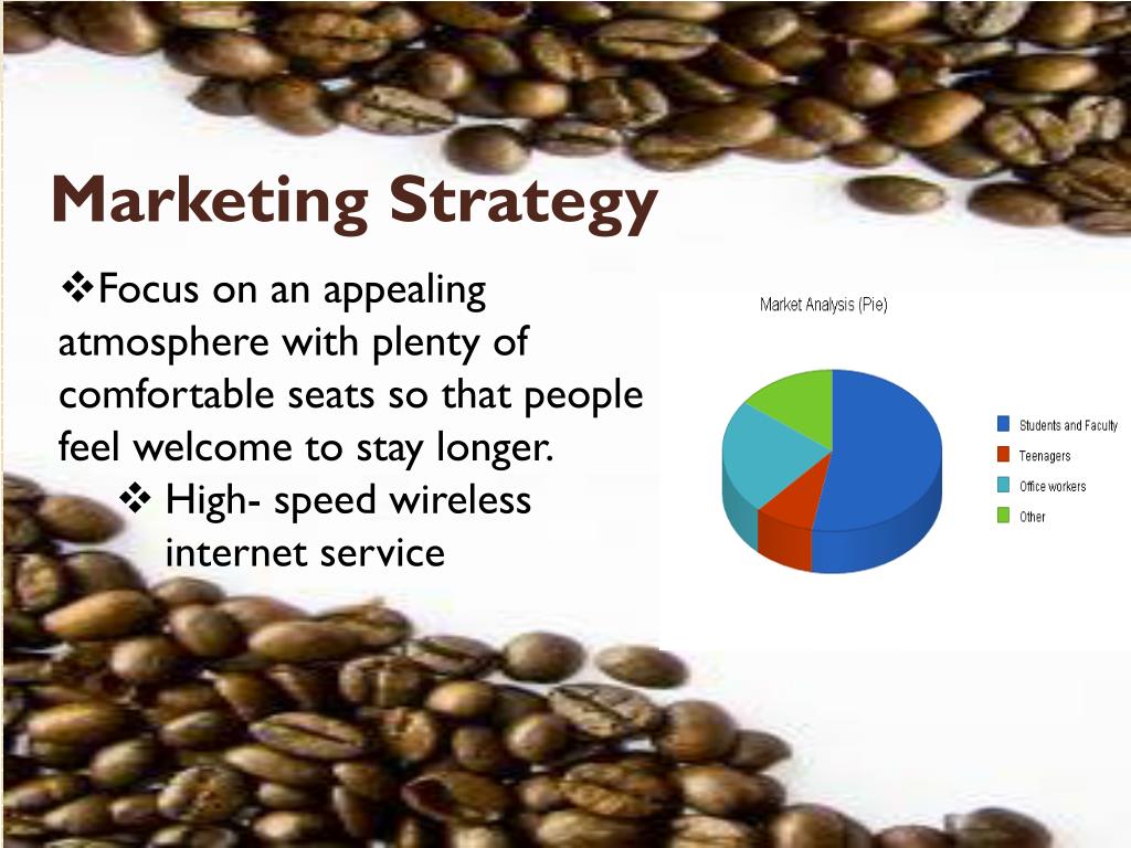 Marketing Strategy • Focus on an appealing atmosphere with plenty of comfortable seats so that people feel welcome to stay longer. • High- speed wireless internet service