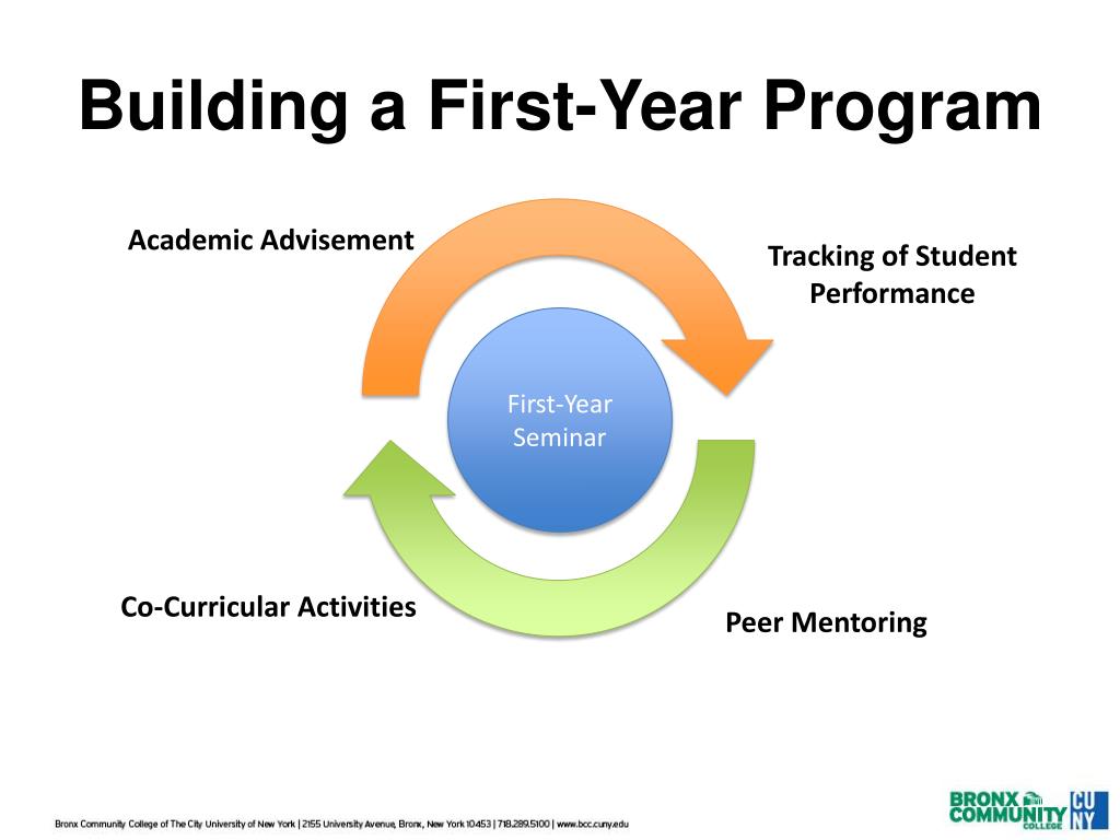 Building a First-Year Program Academic Advisement Tracking of Student Performance First-Year Seminar Co-Curricular Activities Peer Mentoring