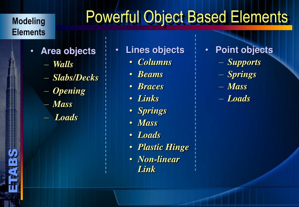 Powerful Object Based Elements Modeling Elements • Area objects • Walls • Slabs/Decks • Opening • Mass • Loads • Lines objects • Columns • Beams • Braces • Links • Springs • Mass • Loads • Plastic Hinge • Non-linear Link • Point objects • Supports • Springs • Mass • Loads