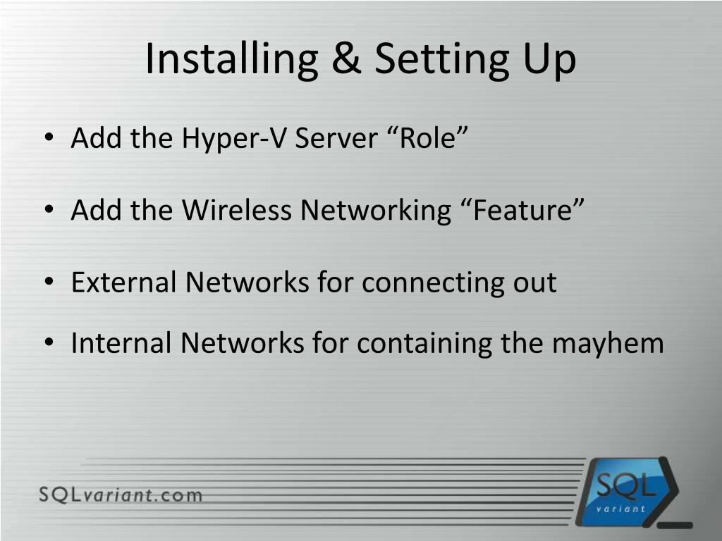 Installing & Setting Up • Add the Hyper-V Server “Role” • Add the Wireless Networking “Feature” • External Networks for connecting out • Internal Networks for containing the mayhem