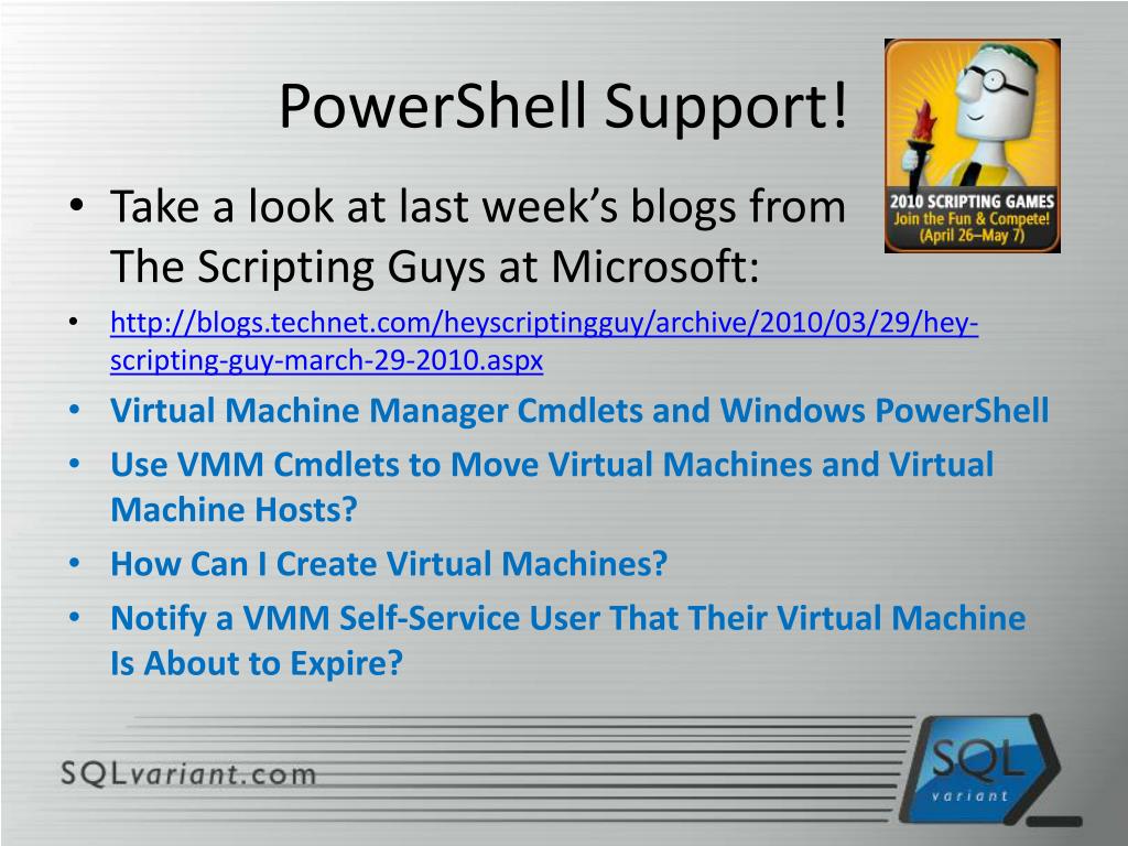 PowerShell Support! • Take a look at last week’s blogs from The Scripting Guys at Microsoft: • http://blogs.technet.com/heyscriptingguy/archive/2010/03/29/hey-scripting-guy-march-29-2010.aspx • Virtual Machine Manager Cmdlets and Windows PowerShell • Use VMM Cmdlets to Move Virtual Machines and Virtual Machine Hosts? • How Can I Create Virtual Machines? • Notify a VMM Self-Service User That Their Virtual Machine Is About to Expire?