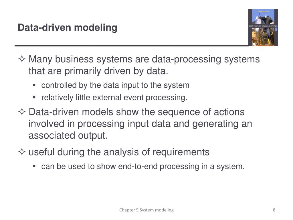 Data-driven modeling • Many business systems are data-processing systems that are primarily driven by data. • controlled by the data input to the system • relatively little external event processing. • Data-driven models show the sequence of actions involved in processing input data and generating an associated output. • useful during the analysis of requirements • can be used to show end-to-end processing in a system. Chapter 5 System modeling