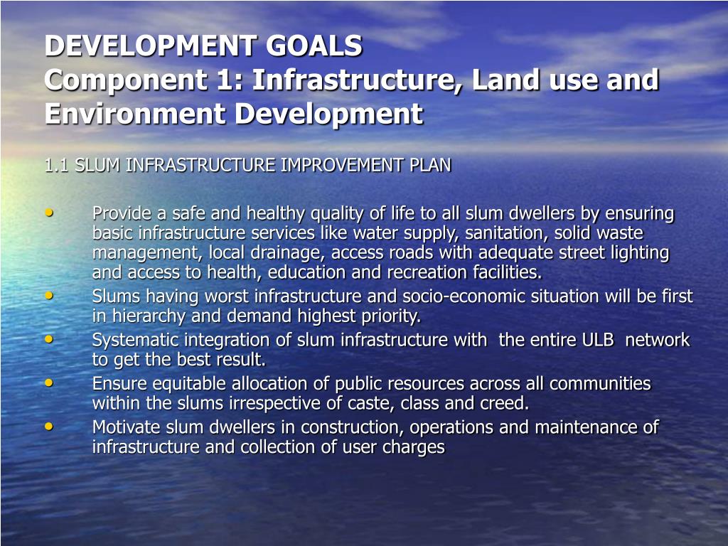 DEVELOPMENT GOALSComponent 1: Infrastructure, Land use and Environment Development 1.1 SLUM INFRASTRUCTURE IMPROVEMENT PLAN • Provide a safe and healthy quality of life to all slum dwellers by ensuring basic infrastructure services like water supply, sanitation, solid waste management, local drainage, access roads with adequate street lighting and access to health, education and recreation facilities. • Slums having worst infrastructure and socio-economic situation will be first in hierarchy and demand highest priority. • Systematic integration of slum infrastructure with the entire ULB network to get the best result. • Ensure equitable allocation of public resources across all communities within the slums irrespective of caste, class and creed. • Motivate slum dwellers in construction, operations and maintenance of infrastructure and collection of user charges