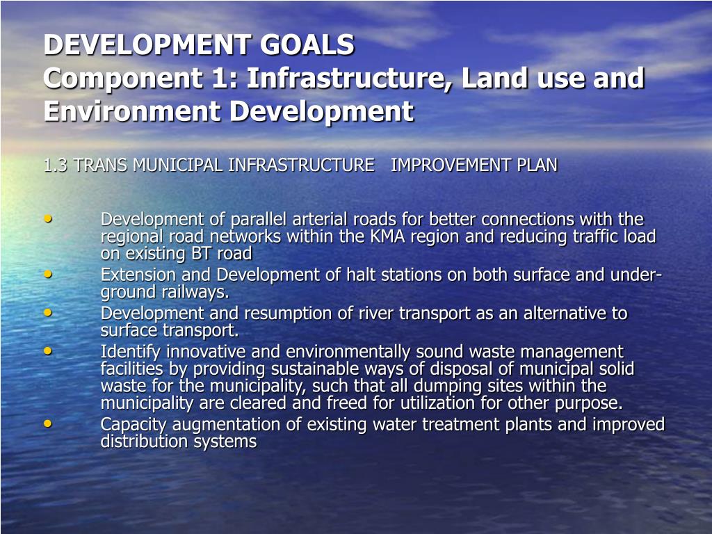 DEVELOPMENT GOALSComponent 1: Infrastructure, Land use and Environment Development 1.3 TRANS MUNICIPAL INFRASTRUCTURE IMPROVEMENT PLAN • Development of parallel arterial roads for better connections with the regional road networks within the KMA region and reducing traffic load on existing BT road • Extension and Development of halt stations on both surface and under-ground railways. • Development and resumption of river transport as an alternative to surface transport. • Identify innovative and environmentally sound waste management facilities by providing sustainable ways of disposal of municipal solid waste for the municipality, such that all dumping sites within the municipality are cleared and freed for utilization for other purpose. • Capacity augmentation of existing water treatment plants and improved distribution systems