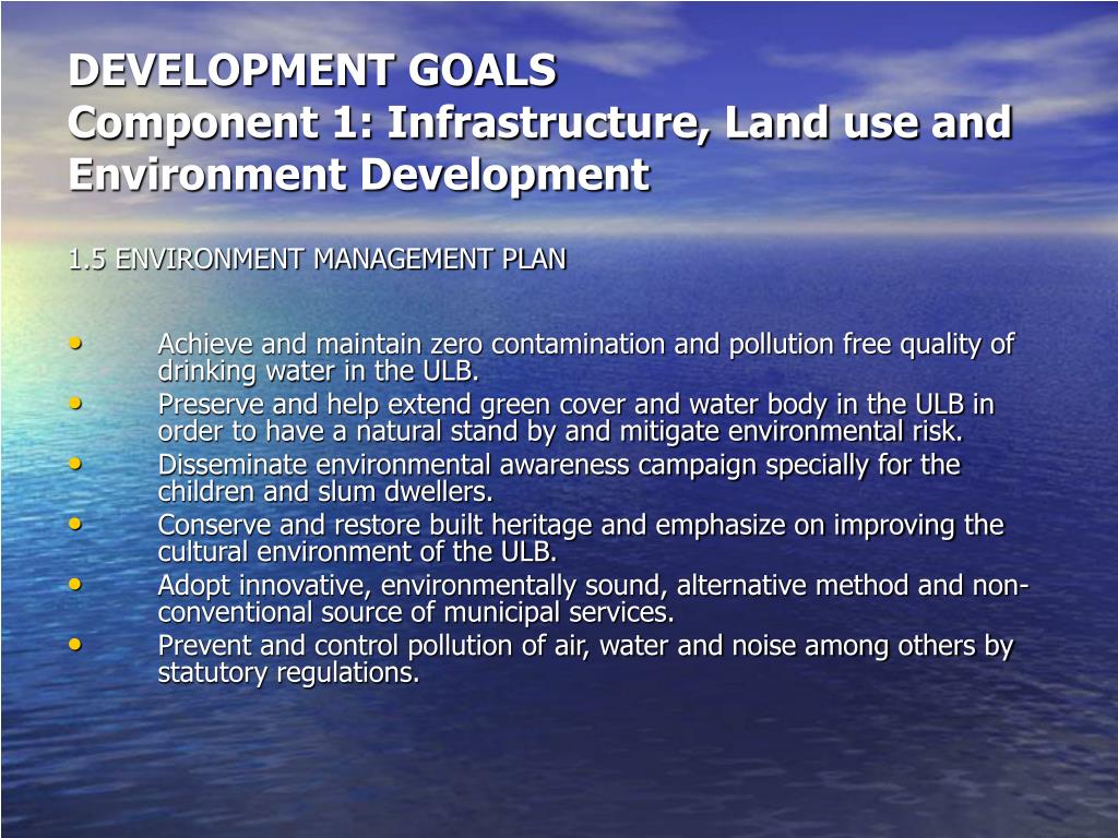 DEVELOPMENT GOALSComponent 1: Infrastructure, Land use and Environment Development 1.5 ENVIRONMENT MANAGEMENT PLAN • Achieve and maintain zero contamination and pollution free quality of drinking water in the ULB. • Preserve and help extend green cover and water body in the ULB in order to have a natural stand by and mitigate environmental risk. • Disseminate environmental awareness campaign specially for the children and slum dwellers. • Conserve and restore built heritage and emphasize on improving the cultural environment of the ULB. • Adopt innovative, environmentally sound, alternative method and non-conventional source of municipal services. • Prevent and control pollution of air, water and noise among others by statutory regulations.