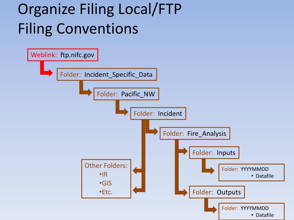 Organize Filing Local/FTP Filing Conventions Weblink: ftp.nifc.gov Folder: Incident_Specific_Data Folder: Pacific_NW Folder: Incident Folder: Fire_Analysis Folder: Inputs • Other Folders: • IR • GIS • Etc. • Folder: YYYYMMDD • Datafile Folder: Outputs • Folder: YYYYMMDD • Datafile