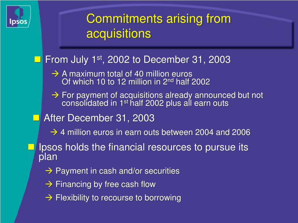 Commitments arising from acquisitions • From July 1st, 2002 to December 31, 2003 • A maximum total of 40 million eurosOf which 10 to 12 million in 2nd half 2002 • For payment of acquisitions already announced but not consolidated in 1st half 2002 plus all earn outs • After December 31, 2003 • 4 million euros in earn outs between 2004 and 2006 • Ipsos holds the financial resources to pursue its plan • Payment in cash and/or securities • Financing by free cash flow • Flexibility to recourse to borrowing