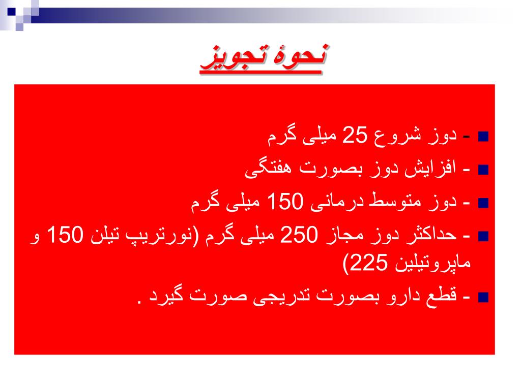 نحوۀ تجویز • - دوز شروع 25 میلی گرم • - افزایش دوز بصورت هفتگی • - دوز متوسط درمانی 150 میلی گرم • - حداکثر دوز مجاز 250 میلی گرم (نورتریپ تیلن 150 و ماپروتیلین 225) • - قطع دارو بصورت تدریجی صورت گیرد .