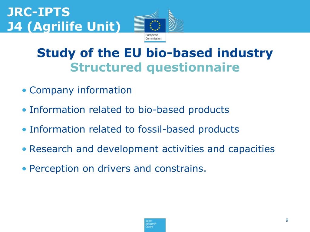 JRC-IPTS J4 (Agrilife Unit) Study of the EU bio-based industryStructured questionnaire • Company information • Information related to bio-based products • Information related to fossil-based products • Research and development activities and capacities • Perceptionon drivers and constrains.