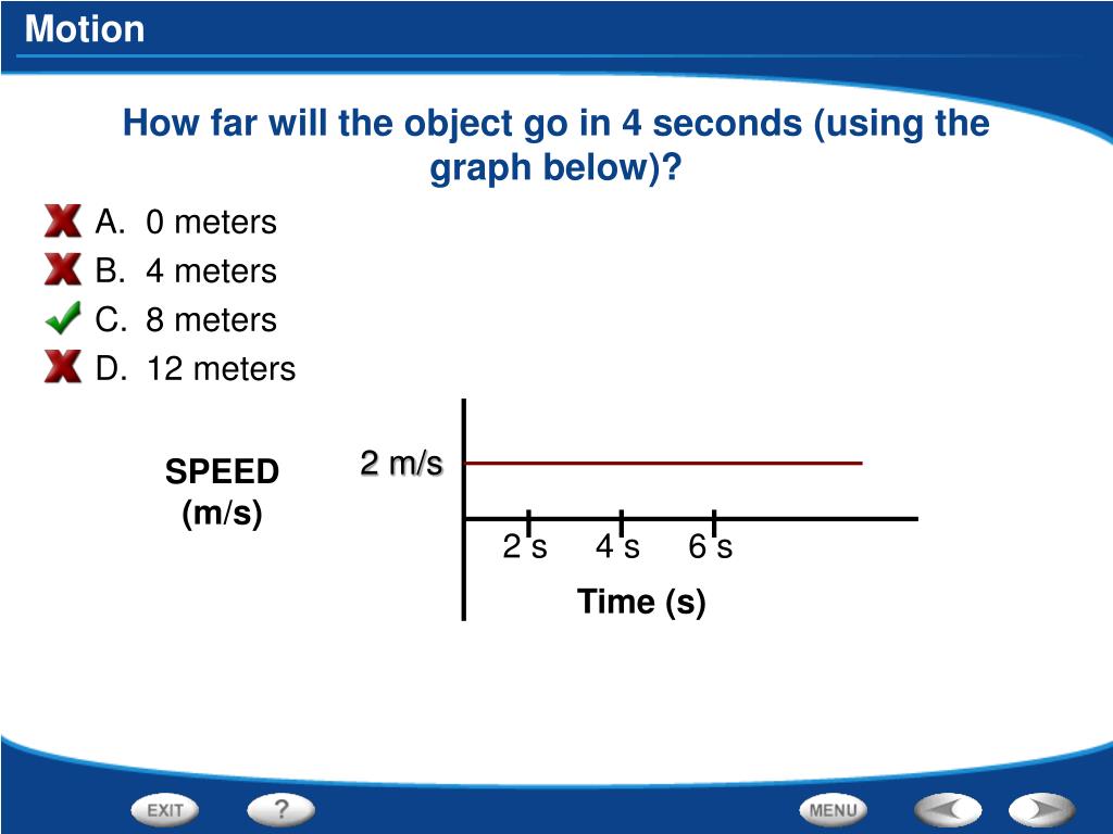 How far will the object go in 4 seconds (using the graph below)? • 0 meters • 4 meters • 8 meters • 12 meters 2 m/s SPEED (m/s) 2 s 4 s 6 s Time (s)