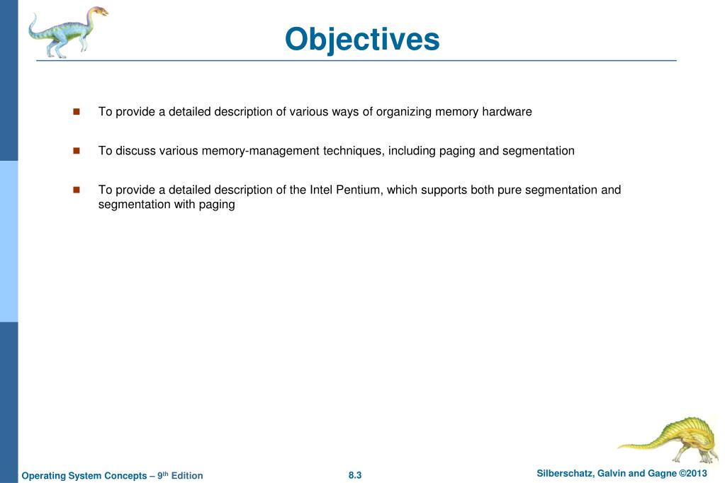 Objectives • To provide a detailed description of various ways of organizing memory hardware • To discuss various memory-management techniques, including paging and segmentation • To provide a detailed description of the Intel Pentium, which supports both pure segmentation and segmentation with paging