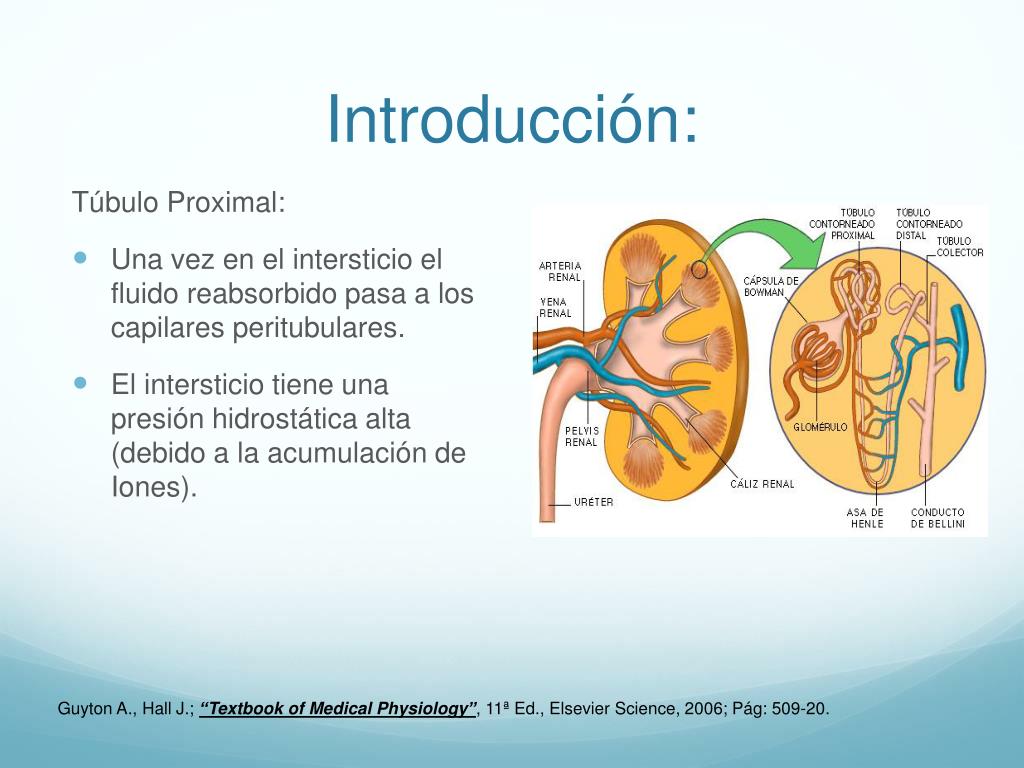 Introducción: Túbulo Proximal: • Una vez en el intersticio el fluido reabsorbido pasa a los capilares peritubulares. • El intersticio tiene una presión hidrostática alta (debido a la acumulación de Iones). Guyton A., Hall J.; “Textbookof Medical Physiology”, 11ª Ed., Elsevier Science, 2006; Pág: 509-20.