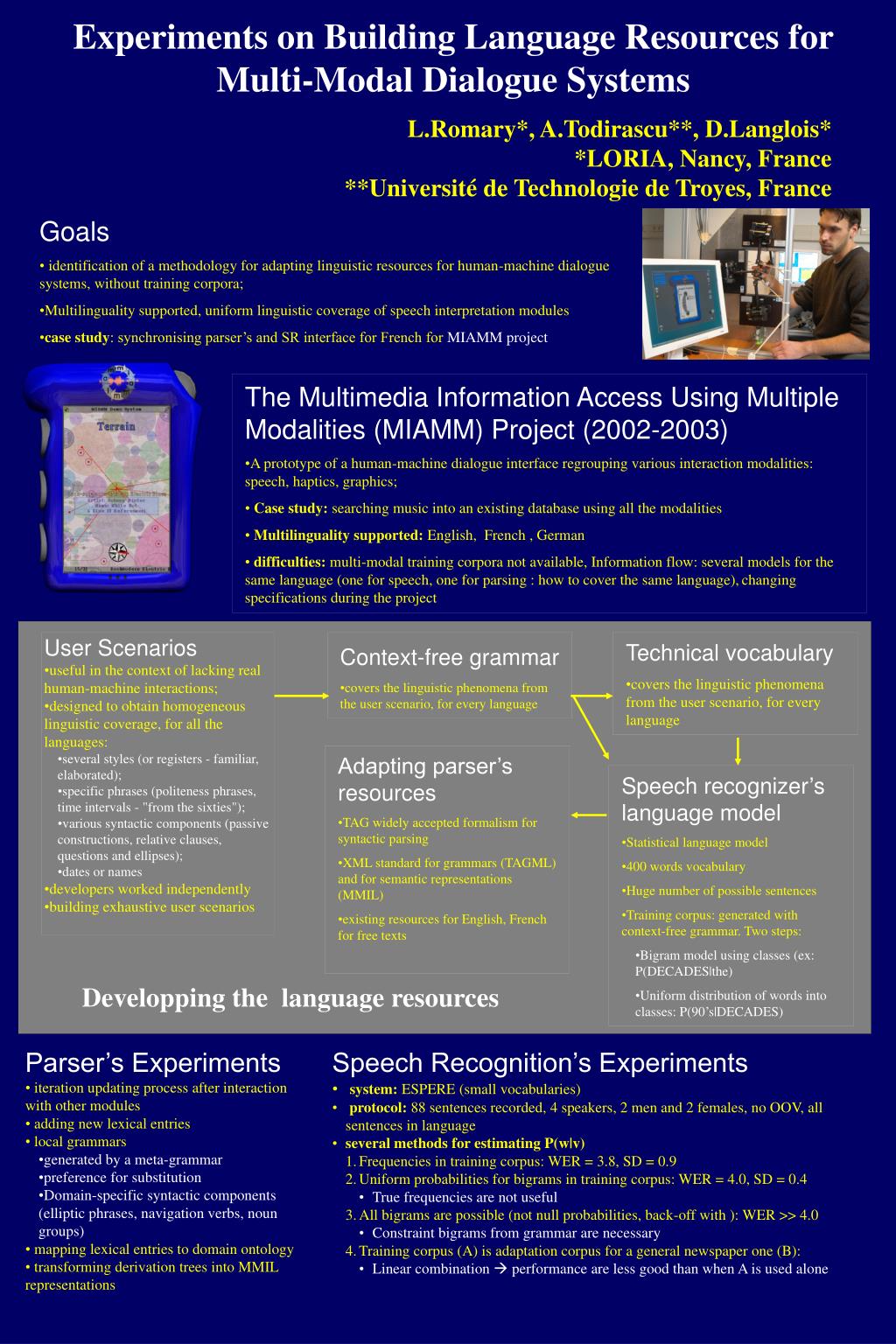 This project involves building language resources for multi-modal dialogue systems without training corpora, focusing on speech interpretation modules. It aims to support multilingual interactions with uniform linguistic coverage. The case study includes synchronizing parsers and speech recognition interfaces for the MIAMM project, which features a prototype of a dialogue interface utilizing speech, haptics, and graphics. Challenges include the lack of multi-modal training data and dealing with changing project specifications. The experiments involve updating parsers iteratively, adding lexical entries, and mapping domain-specific syntactic components to ontologies. Speech recognition experiments with the ESPERE system achieved low word error rates using various estimation methods. Adaptation corpora and linguistic resources were crucial in enhancing system performance.
