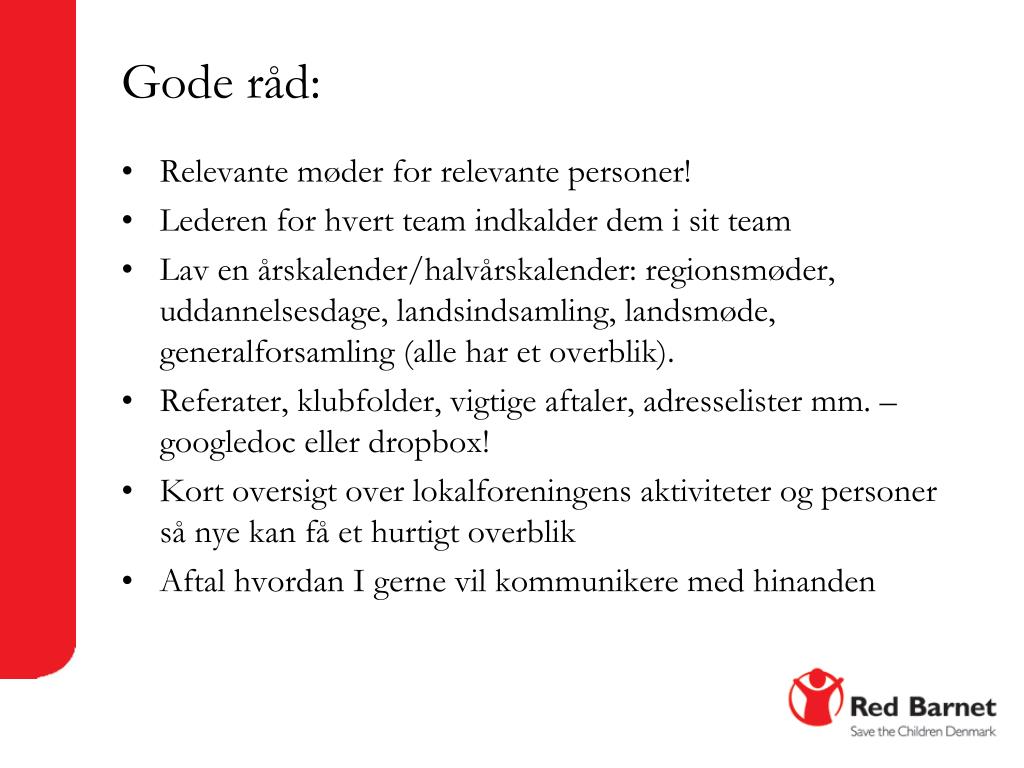 Gode råd: • Relevante møder for relevante personer! • Lederen for hvert team indkalder dem i sit team • Lav en årskalender/halvårskalender: regionsmøder, uddannelsesdage, landsindsamling, landsmøde, generalforsamling (alle har et overblik). • Referater, klubfolder, vigtige aftaler, adresselister mm. – googledoc eller dropbox! • Kort oversigt over lokalforeningens aktiviteter og personer så nye kan få et hurtigt overblik • Aftal hvordan I gerne vil kommunikere med hinanden