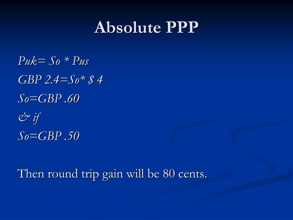 Absolute PPP Puk= So * Pus GBP 2.4=So* $ 4 So=GBP .60 & if So=GBP .50 Then round trip gain will be 80 cents.