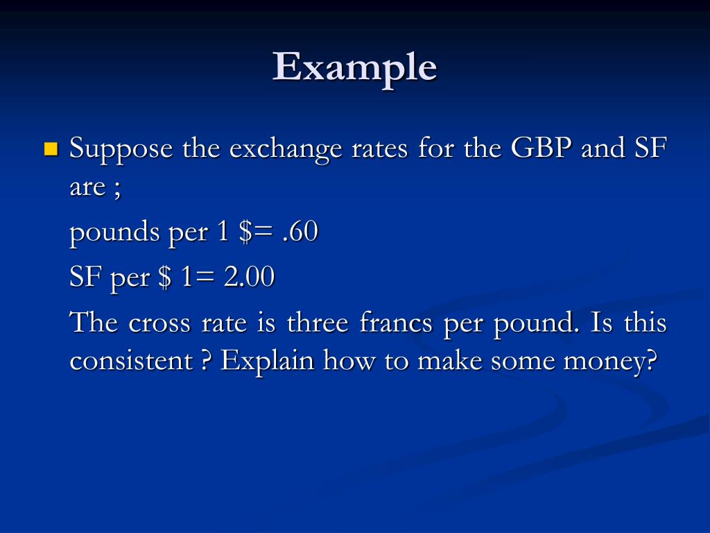 Example Suppose the exchange rates for the GBP and SF are ; pounds per 1 $= .60 SF per $ 1= 2.00 The cross rate is three francs per pound. Is this consistent ? Explain how to make some money?