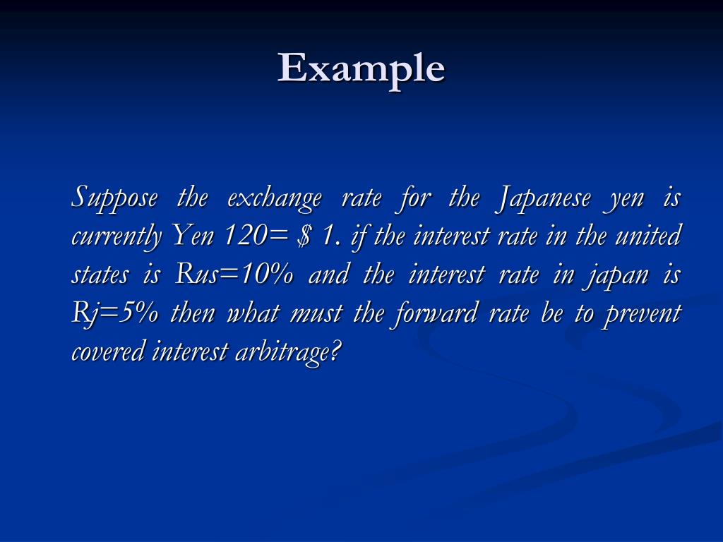 Example Suppose the exchange rate for the Japanese yen is currently Yen 120= $ 1. if the interest rate in the united states is Rus=10% and the interest rate in japan is Rj=5% then what must the forward rate be to prevent covered interest arbitrage?