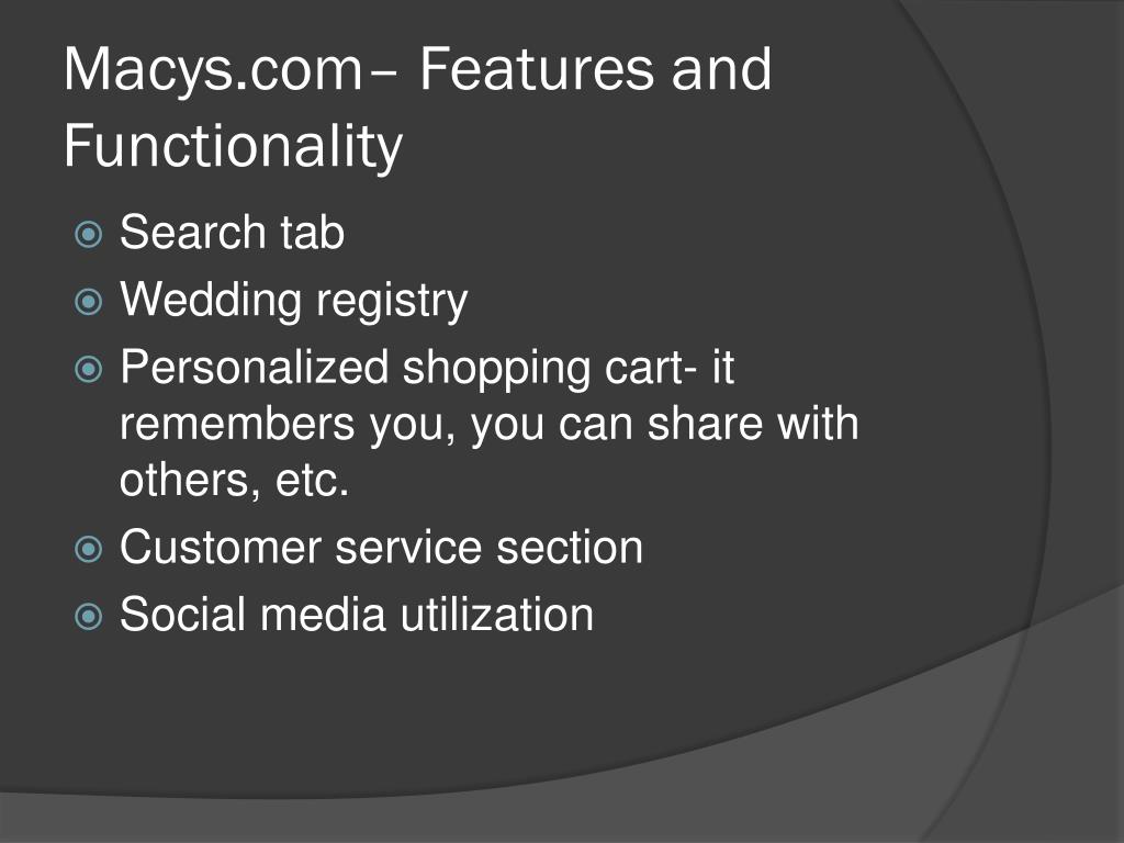 Macys.com– Features and Functionality • Search tab • Wedding registry • Personalized shopping cart- it remembers you, you can share with others, etc. • Customer service section • Social media utilization