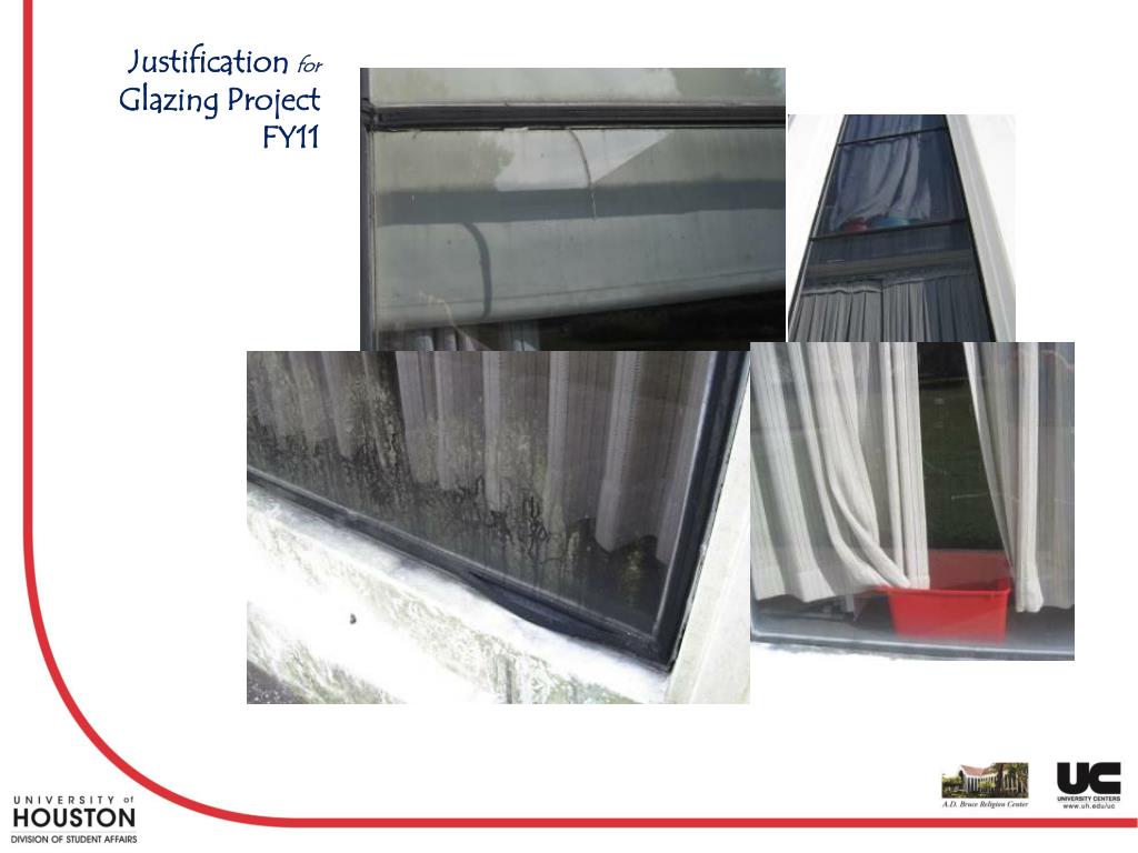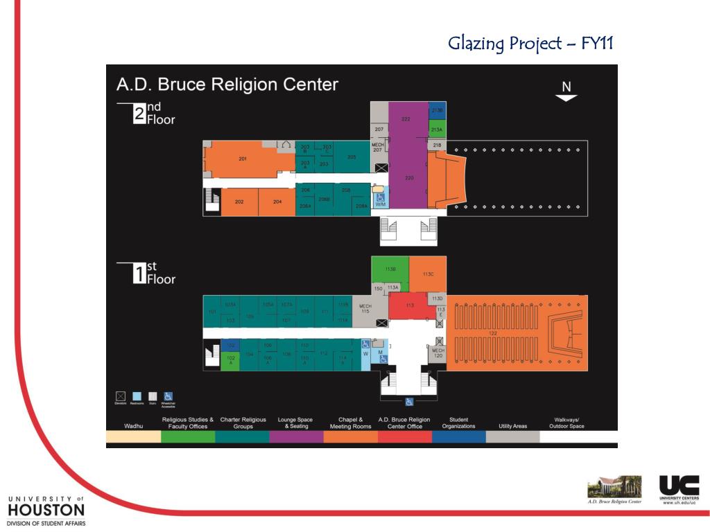 FY 2011 – One Time Allocation Requests • A portion of the utilities cost not covered by the endowment from the • Rockwell Foundation. • Utilities Total $21,605 • Tosupport the glazing of 36 additional exterior windows which are • located in the east wing of the A. D. Bruce Religion Center. • Glazing of exterior windows Total - $338,676 • To support the replacement of carpet in the public areas on the 2nd • floor of A.D. Bruce Religion Center. • Carpet Replacement Total - $19,121 • To support student wages and benefits for Spring 2011. • Student Wages & Benefits Total - $6,658.00 A.D. Bruce Religion Center