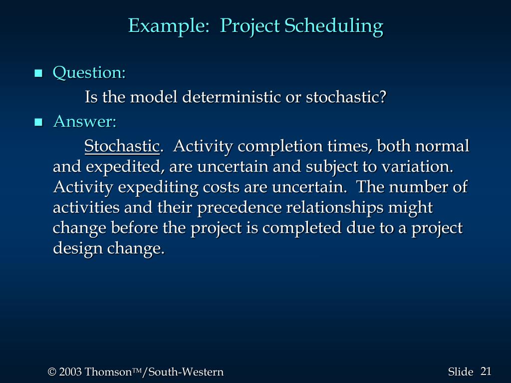Example: Project Scheduling • Question: Is the model deterministic or stochastic? • Answer: Stochastic. Activity completion times, both normal and expedited, are uncertain and subject to variation. Activity expediting costs are uncertain. The number of activities and their precedence relationships might change before the project is completed due to a project design change.