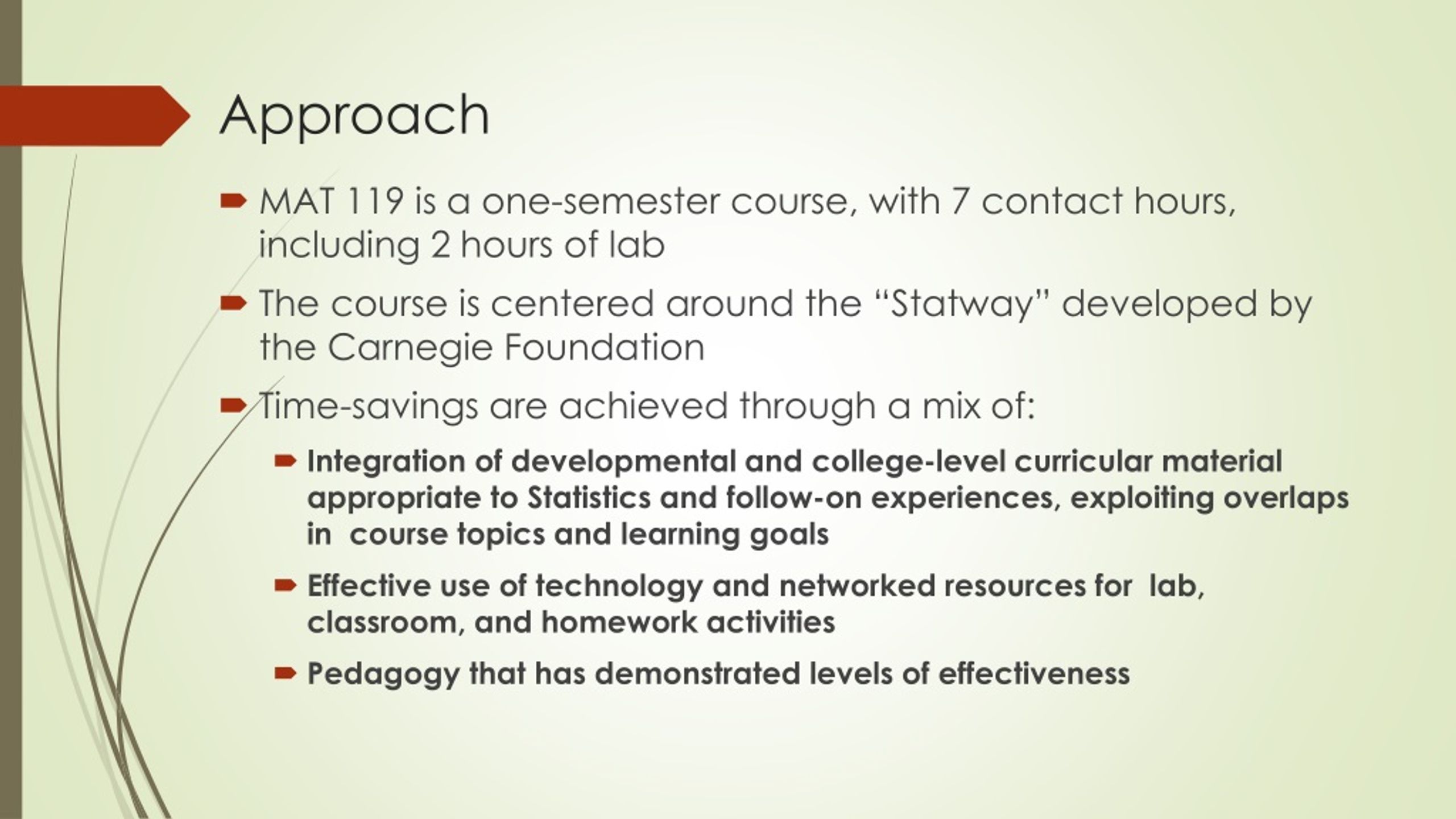 Approach • MAT 119 is a one-semester course, with 7 contact hours, including 2 hours of lab • The course is centered around the “Statway” developed by the Carnegie Foundation • Time-savings are achieved through a mix of: • Integration of developmental and college-level curricular material appropriate to Statistics and follow-on experiences, exploiting overlaps in course topics and learning goals • Effective use of technology and networked resources for lab, classroom, and homework activities • Pedagogy that has demonstrated levels of effectiveness