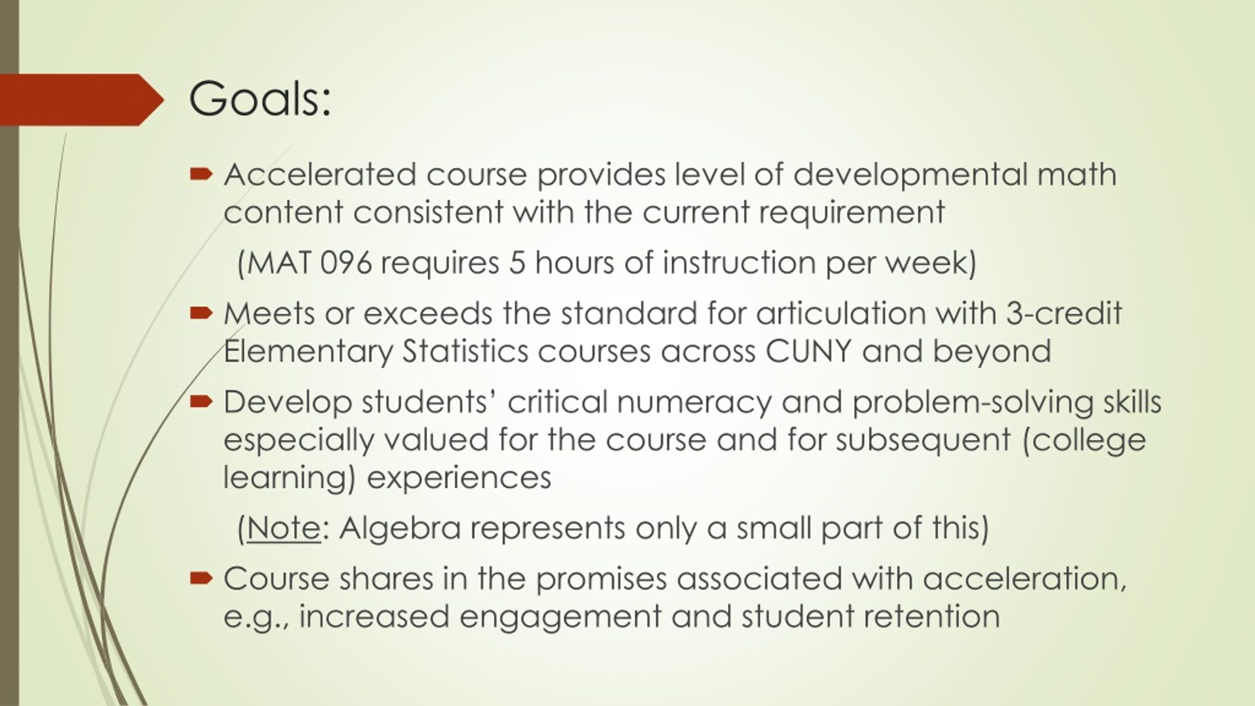Goals: • Accelerated course provides level of developmental math content consistent with the current requirement (MAT 096 requires 5 hours of instruction per week) • Meets or exceeds the standard for articulation with 3-credit Elementary Statistics courses across CUNY and beyond • Develop students’ critical numeracy and problem-solving skills especially valued for the course and for subsequent (college learning) experiences (Note: Algebra represents only a small part of this) • Course shares in the promises associated with acceleration, e.g., increased engagement and student retention