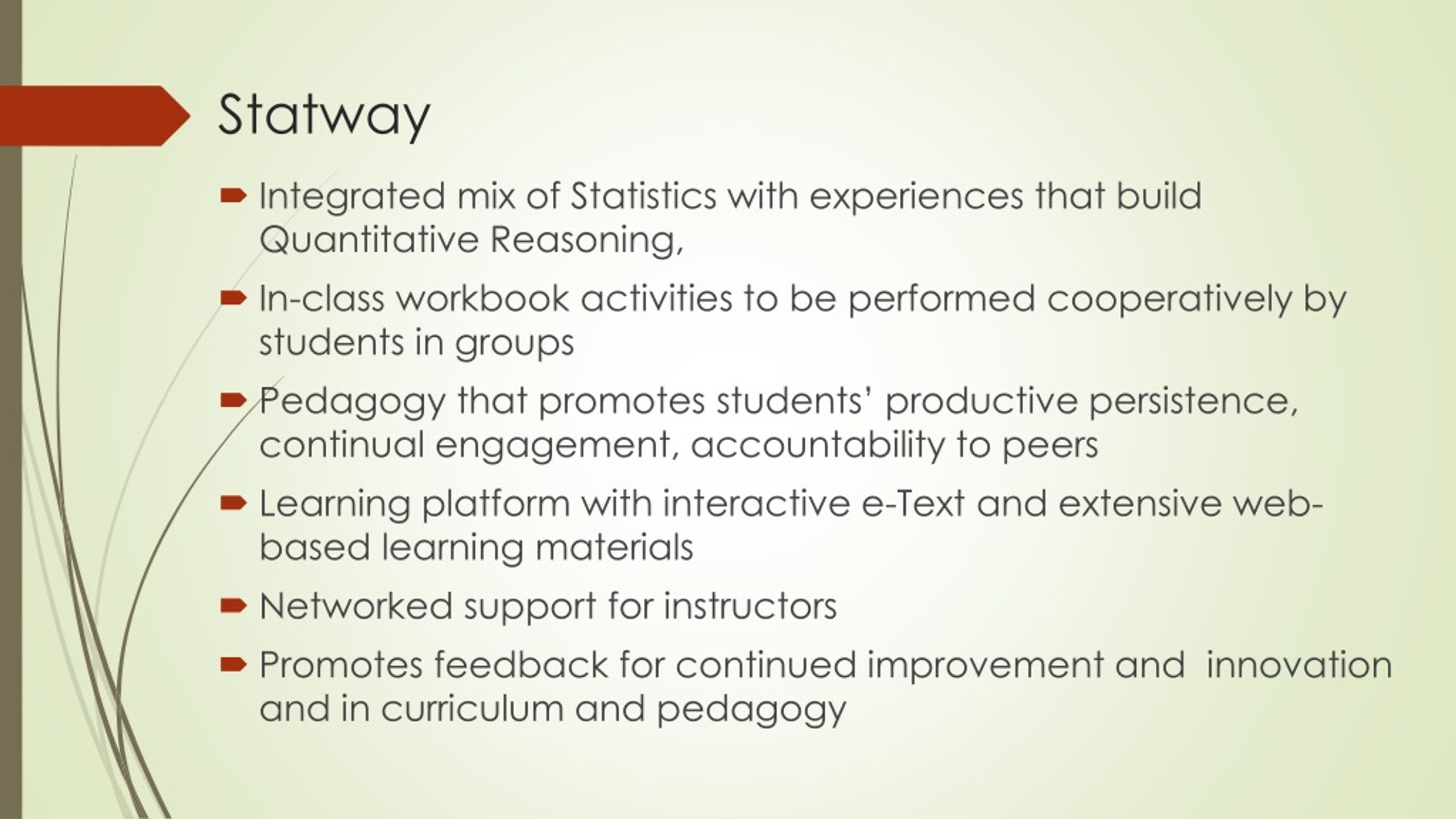 Statway • Integrated mix of Statistics with experiences that build Quantitative Reasoning, • In-class workbook activities to be performed cooperatively by students in groups • Pedagogy that promotes students’ productive persistence, continual engagement, accountability to peers • Learning platform with interactive e-Text and extensive web-based learning materials • Networked support for instructors • Promotes feedback for continued improvement and innovation and in curriculum and pedagogy