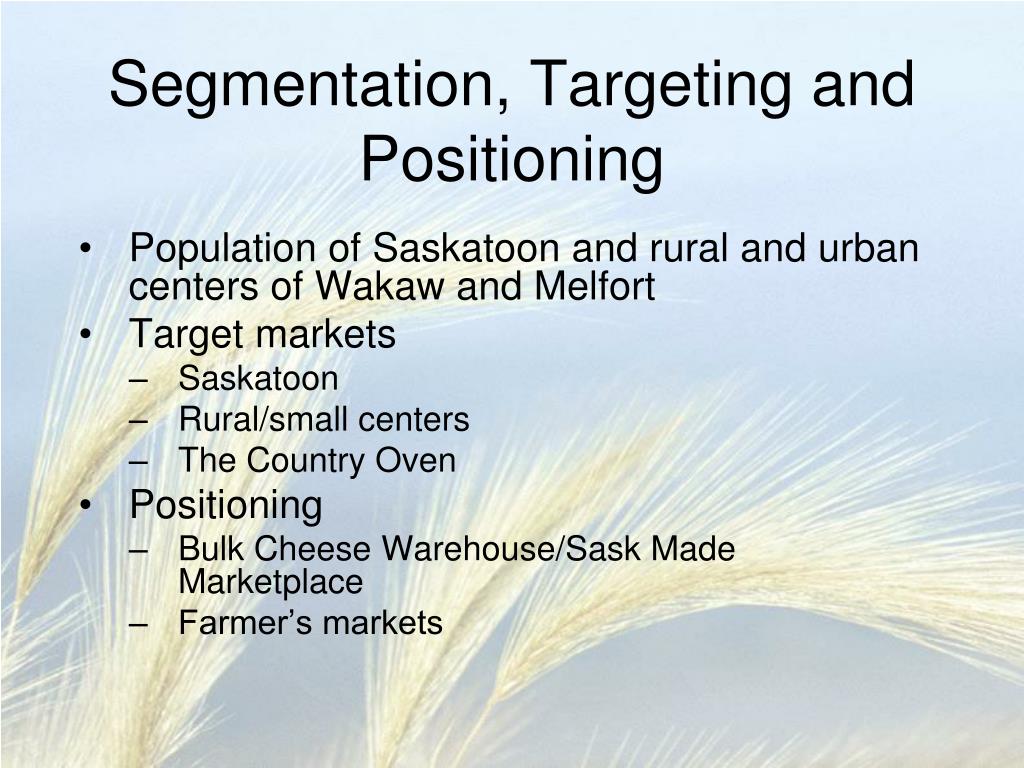 Segmentation, Targeting and Positioning • Population of Saskatoon and rural and urban centers of Wakaw and Melfort • Target markets • Saskatoon • Rural/small centers • The Country Oven • Positioning • Bulk Cheese Warehouse/Sask Made Marketplace • Farmer’s markets