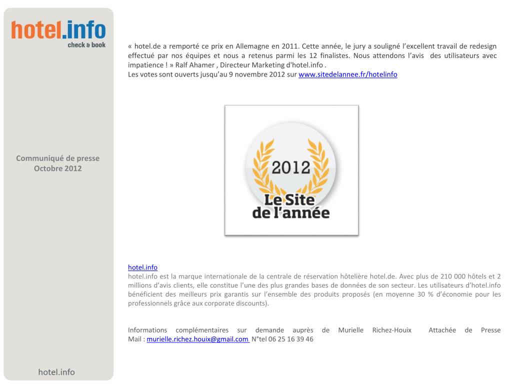 « hotel.de a remporté ce prix en Allemagne en 2011. Cette année, le jury a souligné l’excellent travail de redesign effectué par nos équipes et nous a retenus parmi les 12 finalistes. Nous attendons l’avis des utilisateurs avec impatience ! » Ralf Ahamer, Directeur Marketing d'hotel.info . Les votes sont ouverts jusqu’au 9 novembre 2012 sur www.sitedelannee.fr/hotelinfo Communiqué de presse Octobre 2012 hotel.info hotel.info est la marque internationale de la centrale de réservation hôtelière hotel.de. Avec plus de 210 000 hôtels et 2 millions d’avis clients, elle constitue l’une des plus grandes bases de données de son secteur. Les utilisateurs d’hotel.info bénéficient des meilleurs prix garantis sur l’ensemble des produits proposés (en moyenne 30 % d’économie pour les professionnels grâce aux corporate discounts). Informations complémentaires sur demande auprès de Murielle Richez-Houix Attachée de Presse Mail : murielle.richez.houix@gmail.com N°tel06 25 16 39 46