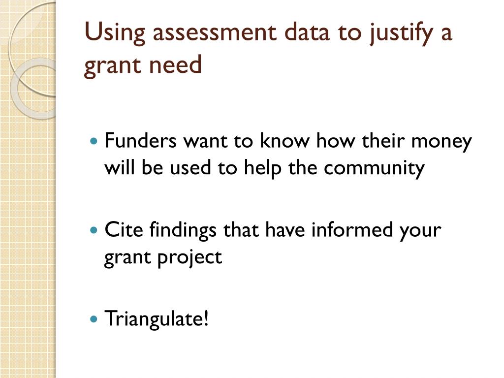 Using assessment data to justify a grant need • Funders want to know how their money will be used to help the community • Cite findings that have informed your grant project • Triangulate!