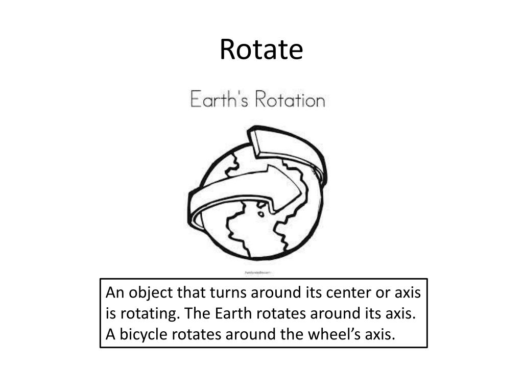 Rotate An object that turns around its center or axis is rotating. The Earth rotates around its axis. A bicycle rotates around the wheel’s axis.