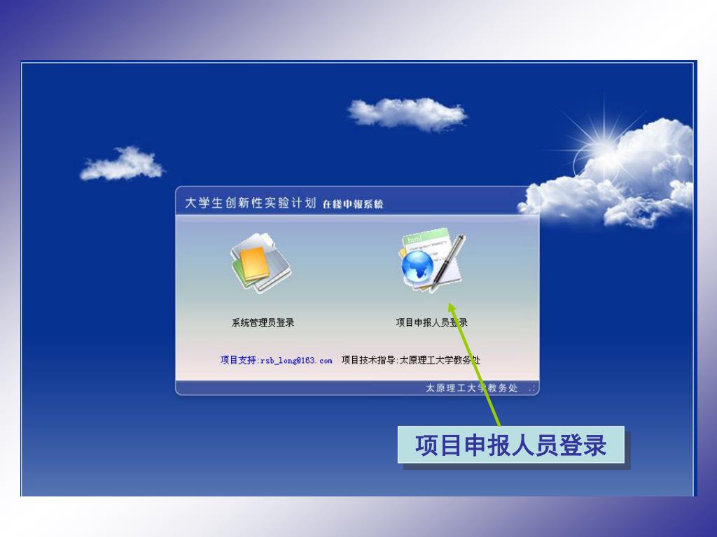 在线申报系统说明. 太原理工大学教务处. 项目申报人员登录. 1. 输入指定用户名称. 2. 输入用户密码. 5. 按提交进入系统. 3. 输入项目编号. 4. 输入系统验证码. 项目申报人员登录. 申报人员界面说明. 结束时退出按钮. 工作区域. 系统导航菜单. 系统版权说明. 窗体滚动条. 可调节栏目位置. 导航菜单收缩开关. 修改项目负责人个人资料. 系统使用注意事项说明. 第一次录入资料登录内容. 修改资料时使用. 登录名称不能修改. 输入原密码. 输入修改后的密码. 相片功能在重新进入系统后显示. 确认新密码. 负责人真实资料.