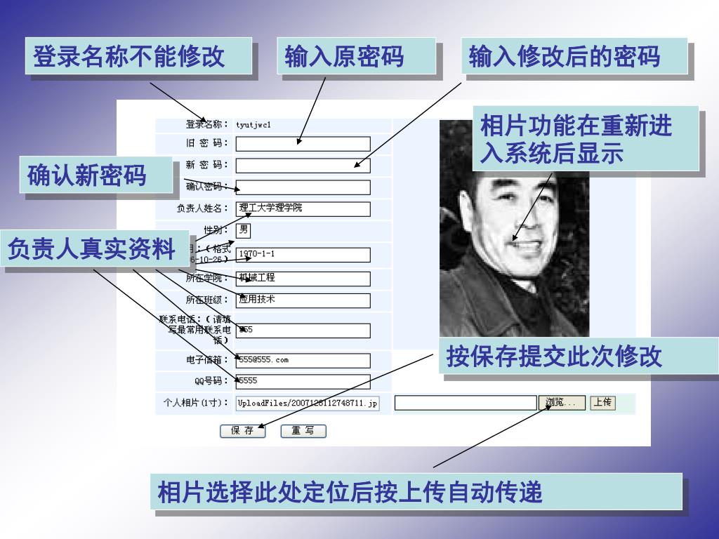 登录名称不能修改 输入原密码 输入修改后的密码 相片功能在重新进入系统后显示 确认新密码 负责人真实资料 按保存提交此次修改 相片选择此处定位后按上传自动传递