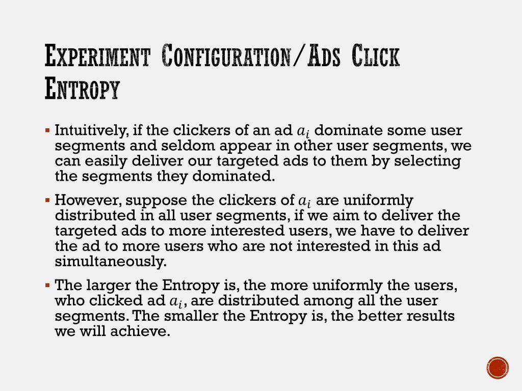 Experiment Configuration/Ads Click Entropy • Intuitively, if the clickers of an ad dominate some user segments and seldom appear in other user segments, we can easily deliver our targeted ads to them by selecting the segments they dominated. • However, suppose the clickers of are uniformly distributed in all user segments, if we aim to deliver the targeted ads to more interested users, we have to deliver the ad to more users who are not interested in this ad simultaneously. • The larger the Entropy is, the more uniformly the users, who clicked ad , are distributed among all the user segments. The smaller the Entropy is, the better results we will achieve.