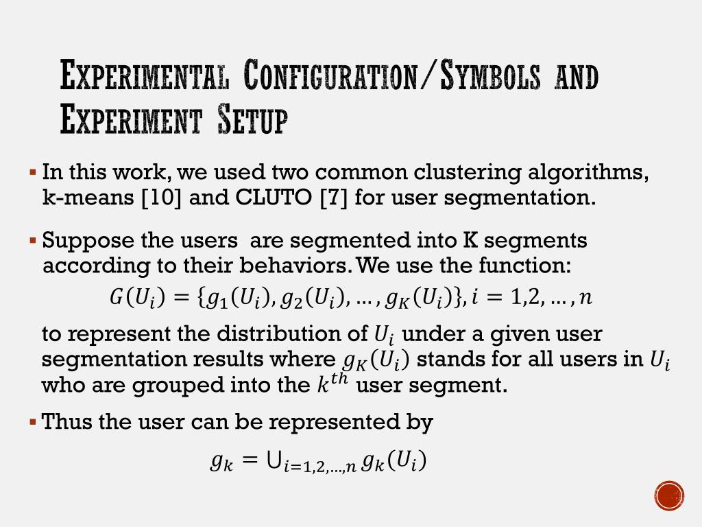Experimental Configuration/Symbols and Experiment Setup • In this work, we used two common clustering algorithms, k-means [10] and CLUTO [7] for user segmentation. • Suppose the users are segmented into K segments according to their behaviors. We use the function: to represent the distribution of under a given user segmentation results where stands for all users in who are grouped into the user segment. • Thus the user can be represented by