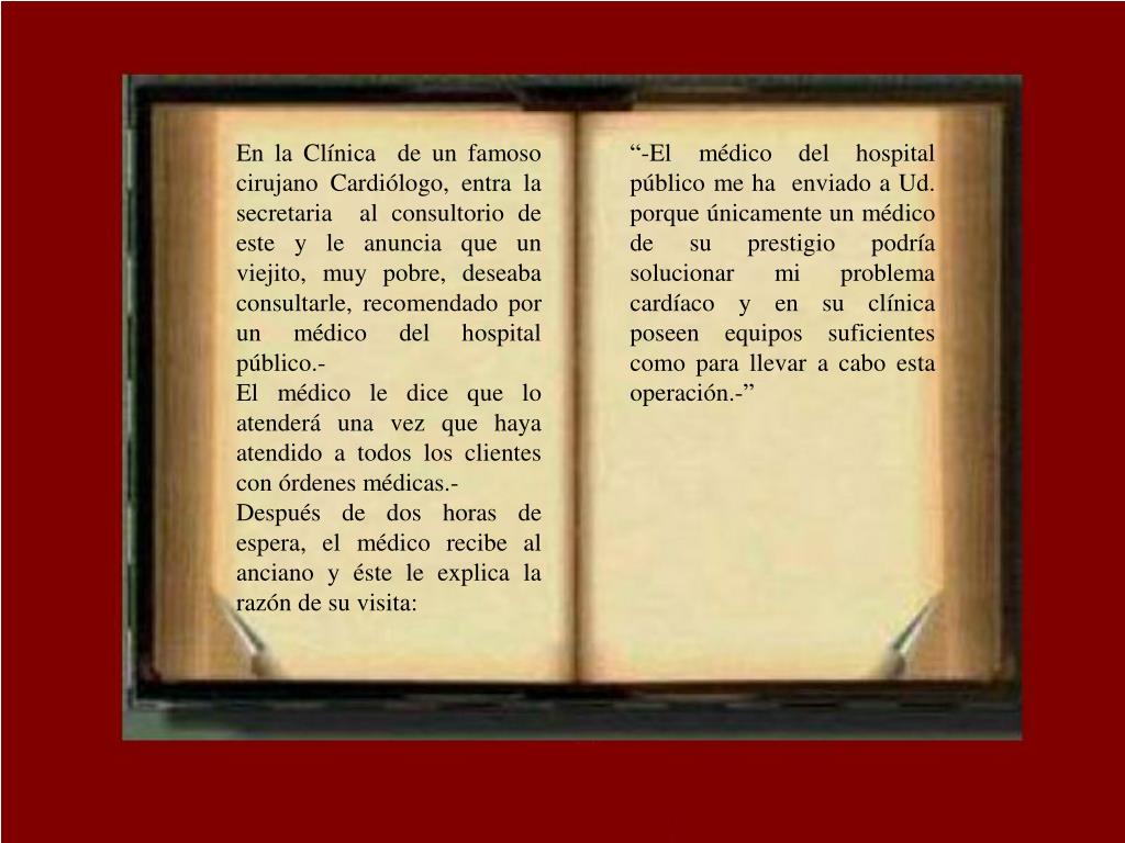 En la Clínica de un famoso cirujano Cardiólogo, entra la secretaria al consultorio de este y le anuncia que un viejito, muy pobre, deseaba consultarle, recomendado por un médico del hospital público.- El médico le dice que lo atenderá una vez que haya atendido a todos los clientes con órdenes médicas.- Después de dos horas de espera, el médico recibe al anciano y éste le explica la razón de su visita: “-El médico del hospital público me ha enviado a Ud. porque únicamente un médico de su prestigio podría solucionar mi problema cardíaco y en su clínica poseen equipos suficientes como para llevar a cabo esta operación.-”