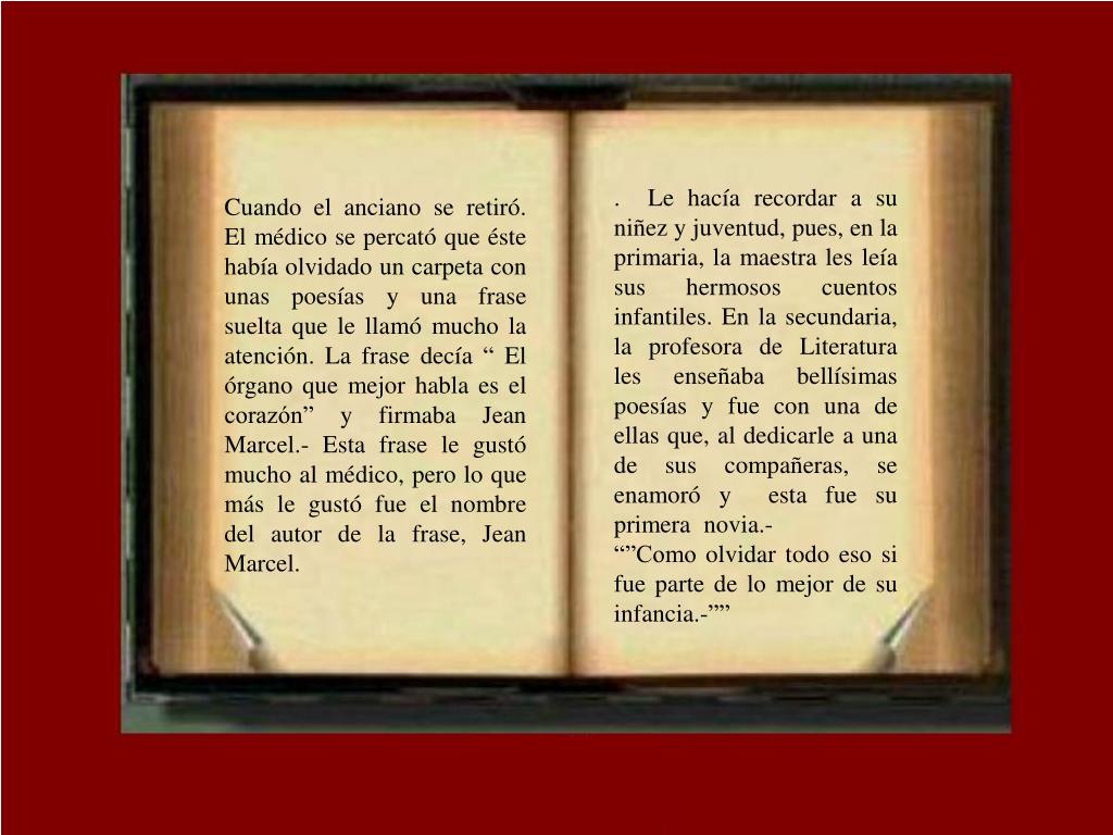 . Le hacía recordar a su niñez y juventud, pues, en la primaria, la maestra les leía sus hermosos cuentos infantiles. En la secundaria, la profesora de Literatura les enseñaba bellísimas poesías y fue con una de ellas que, al dedicarle a una de sus compañeras, se enamoró y esta fue su primera novia.- “”Como olvidar todo eso si fue parte de lo mejor de su infancia.-”” Cuando el anciano se retiró. El médico se percató que éste había olvidado un carpeta con unas poesías y una frase suelta que le llamó mucho la atención. La frase decía “ El órgano que mejor habla es el corazón” y firmaba Jean Marcel.- Esta frase le gustó mucho al médico, pero lo que más le gustó fue el nombre del autor de la frase, Jean Marcel.