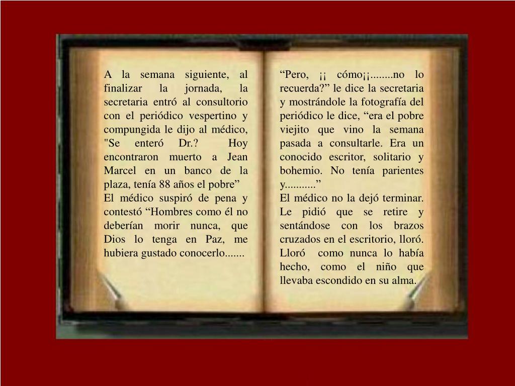 A la semana siguiente, al finalizar la jornada, la secretaria entró al consultorio con el periódico vespertino y compungida le dijo al médico, "Se enteró Dr.? Hoy encontraron muerto a Jean Marcel en un banco de la plaza, tenía 88 años el pobre” El médico suspiró de pena y contestó “Hombres como él no deberían morir nunca, que Dios lo tenga en Paz, me hubiera gustado conocerlo....... “Pero, ¡¡ cómo¡¡........no lo recuerda?” le dice la secretaria y mostrándole la fotografía del periódico le dice, “era el pobre viejito que vino la semana pasada a consultarle. Era un conocido escritor, solitario y bohemio. No tenía parientes y...........” El médico no la dejó terminar. Le pidió que se retire y sentándose con los brazos cruzados en el escritorio, lloró. Lloró como nunca lo había hecho, como el niño que llevaba escondido en su alma.