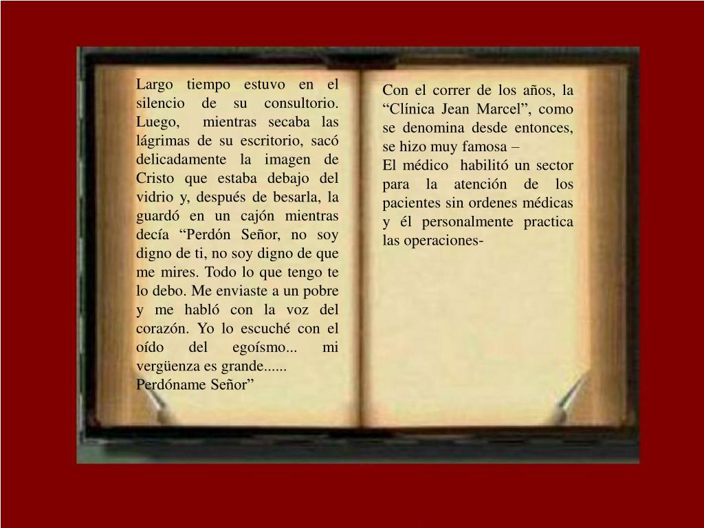 Largo tiempo estuvo en el silencio de su consultorio. Luego, mientras secaba las lágrimas de su escritorio, sacó delicadamente la imagen de Cristo que estaba debajo del vidrio y, después de besarla, la guardó en un cajón mientras decía “Perdón Señor, no soy digno de ti, no soy digno de que me mires. Todo lo que tengo te lo debo. Me enviaste a un pobre y me habló con la voz del corazón. Yo lo escuché con el oído del egoísmo... mi vergüenza es grande...... Perdóname Señor” Con el correr de los años, la “Clínica Jean Marcel”, como se denomina desde entonces, se hizo muy famosa – El médico habilitó un sector para la atención de los pacientes sin ordenes médicas y él personalmente practica las operaciones-
