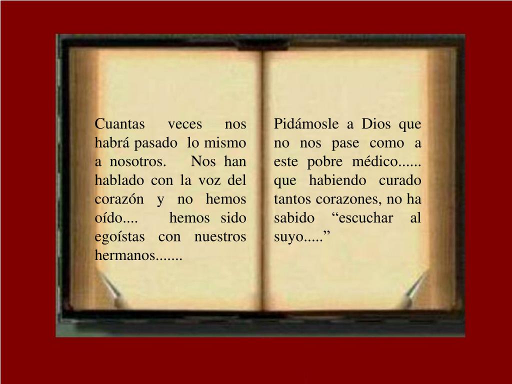 Cuantas veces nos habrá pasado lo mismo a nosotros. Nos han hablado con la voz del corazón y no hemos oído.... hemos sido egoístas con nuestros hermanos....... Pidámosle a Dios que no nos pase como a este pobre médico...... que habiendo curado tantos corazones, no ha sabido “escuchar al suyo.....”