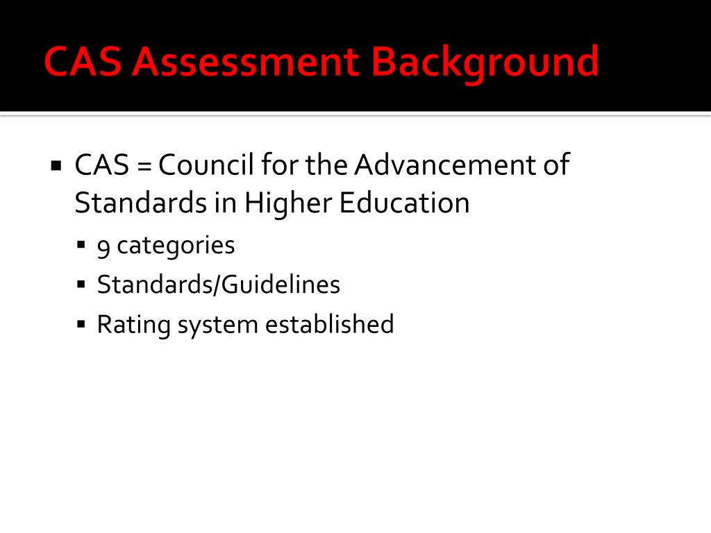 CAS Assessment Background • CAS = Council for the Advancement of Standards in Higher Education • 9 categories • Standards/Guidelines • Rating system established