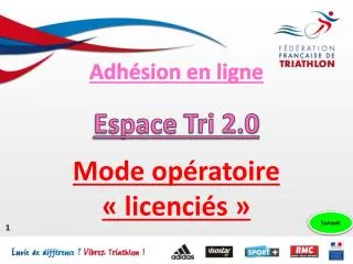 Adhésion en ligne Espace Tri 2.0. Mode opératoire « licenciés ». Suivant. 1. Cette présentation ne fonctionne qu’en utilisant les boutons : de la souris du pavé tactile. Suivant. Retour. 2. Comment prendre ou renouveler sa licence. Retour. Suivant. Comment prendre