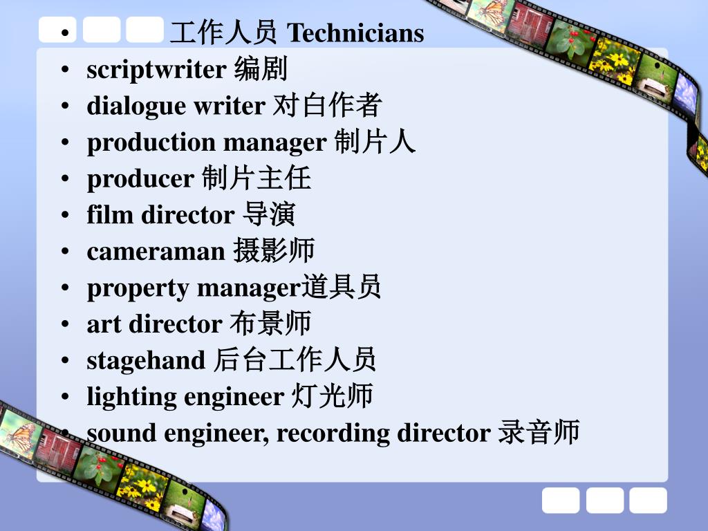 工作人员 Technicians • scriptwriter 编剧 • dialogue writer 对白作者 • production manager 制片人 • producer 制片主任 • film director 导演 • cameraman 摄影师 • property manager道具员 • art director 布景师 • stagehand 后台工作人员 • lighting engineer 灯光师 • sound engineer, recording director 录音师